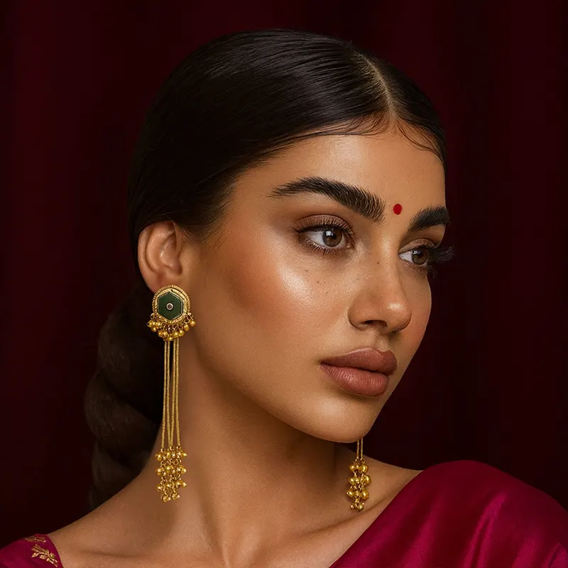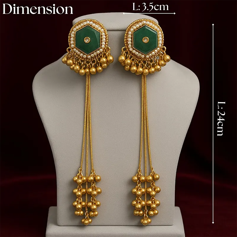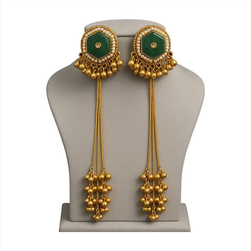 A vibrant fusion of royal elegance and playful charm, the Green Emerald Moti Ghungroo Earrings combine the richness of emerald tones with the soft glow of pearls and the joyful chime of ghungroos. This design brings together tradition and statement style in one irresistible piece.