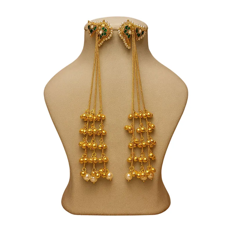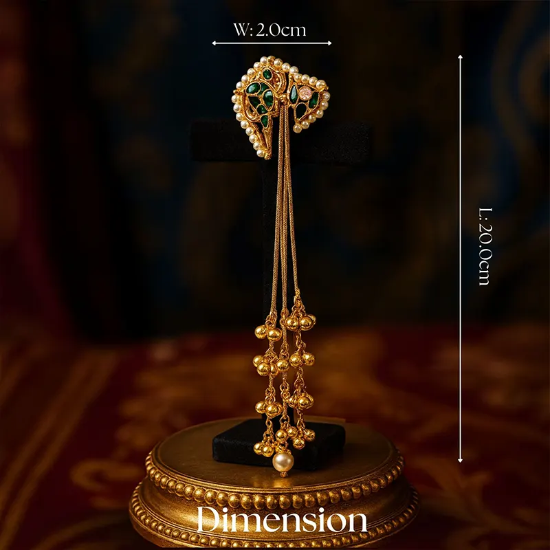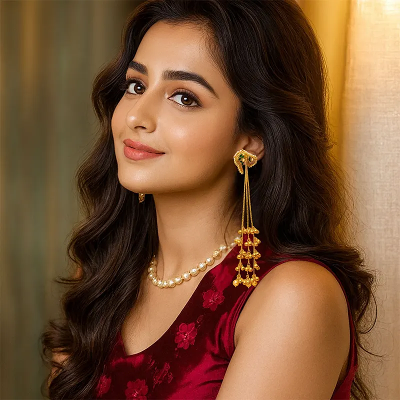 A rhythmic blend of tradition and charm, the Long Ghungroo Baali Earrings with peearls bring the joyful jingle of ghungroos into an elegant, wearable design. With their cascading metallic beads and intricate detailing, they exude festive energy and timeless appeal.