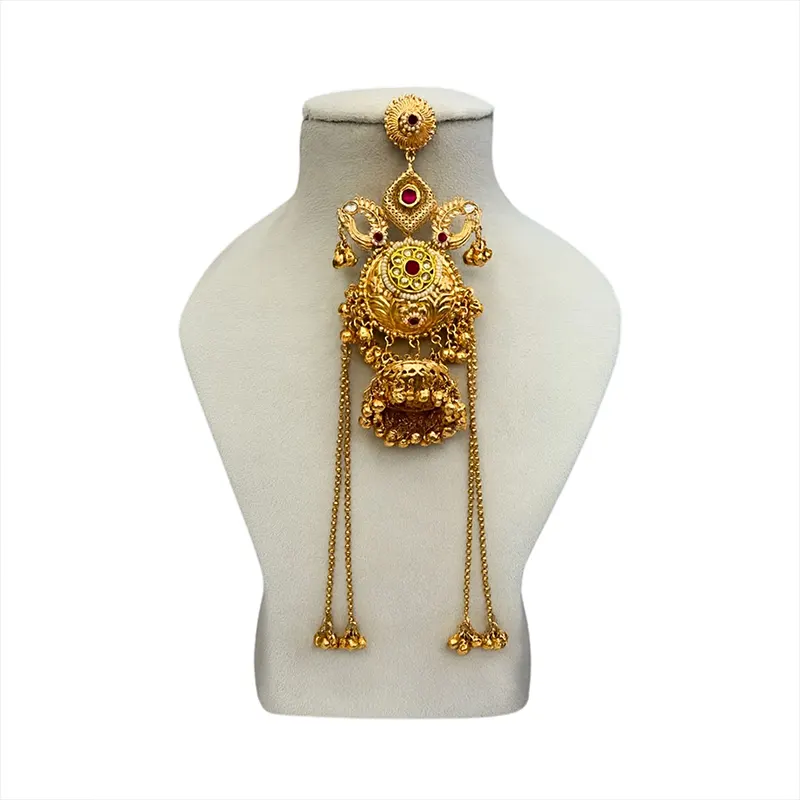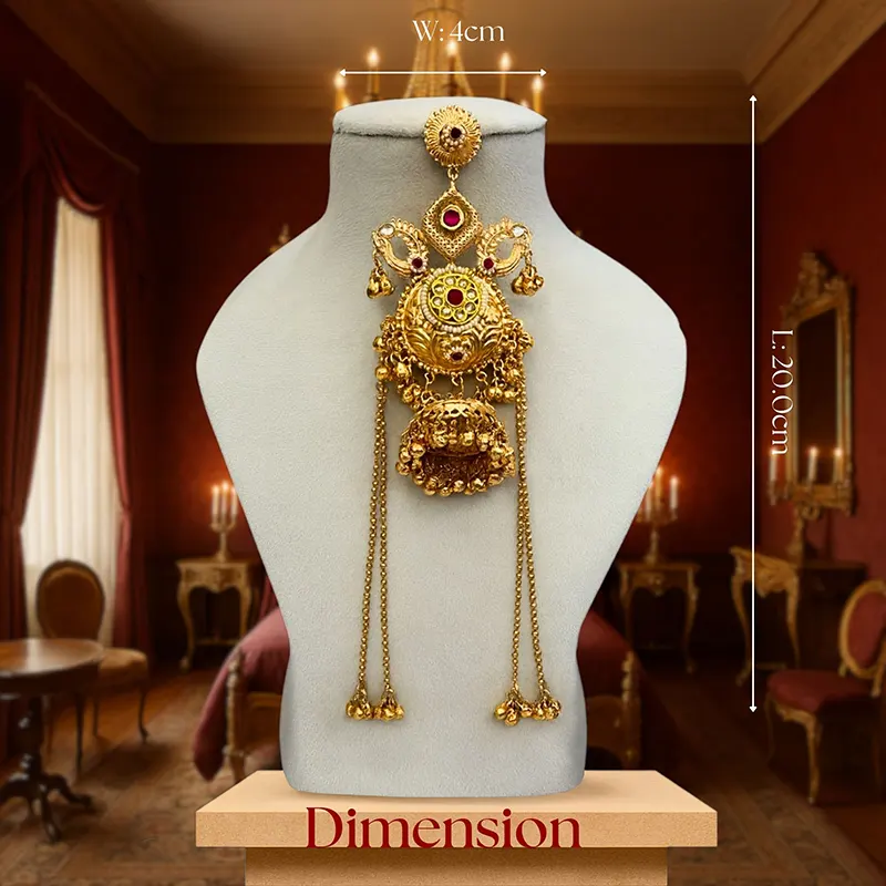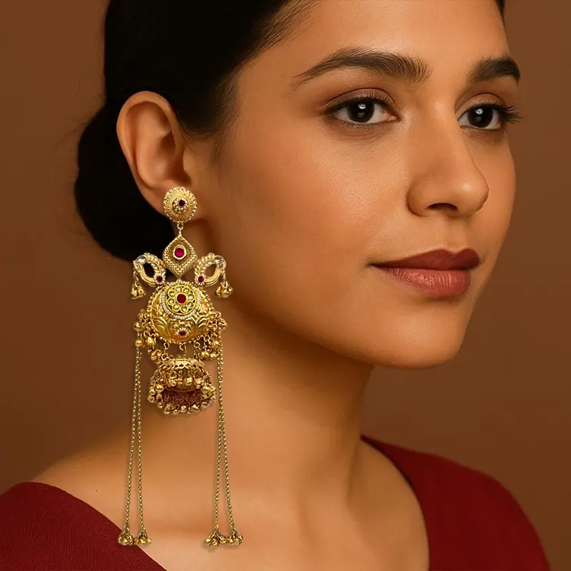A rhythmic blend of tradition and charm, the Long Ghungroo Baali Earrings with peearls bring the joyful jingle of ghungroos into an elegant, wearable design. With their cascading metallic beads and intricate detailing, they exude festive energy and timeless appeal.