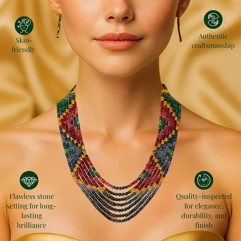 Draped in layers of opulence, the Seven-Layered Beaded Set is a bold celebration of tradition and grandeur. Inspired by royal Indian aesthetics, each cascading strand reflects the timeless elegance of queens and courtesans.