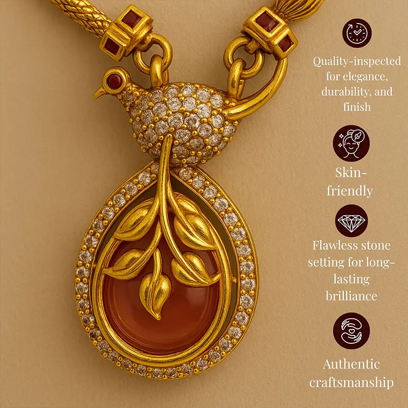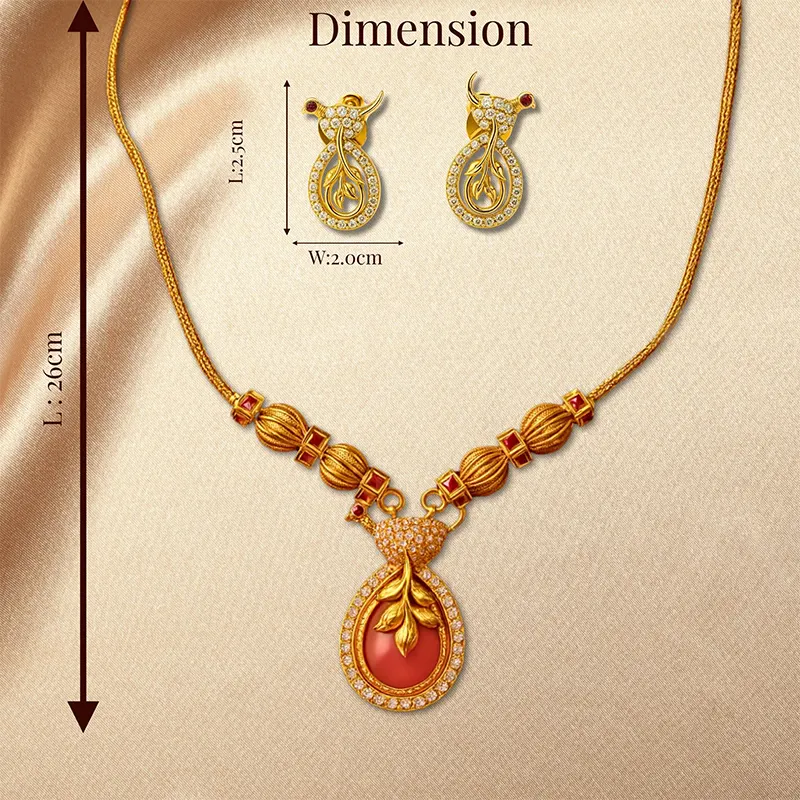 A gold-plated necklace bordered with lustrous pearls and adorned with radiant rubies and emeralds. Carefully curated, delicately placed, and packaged with love, this piece reflects not just craftsmanship, but a legacy of elegance.